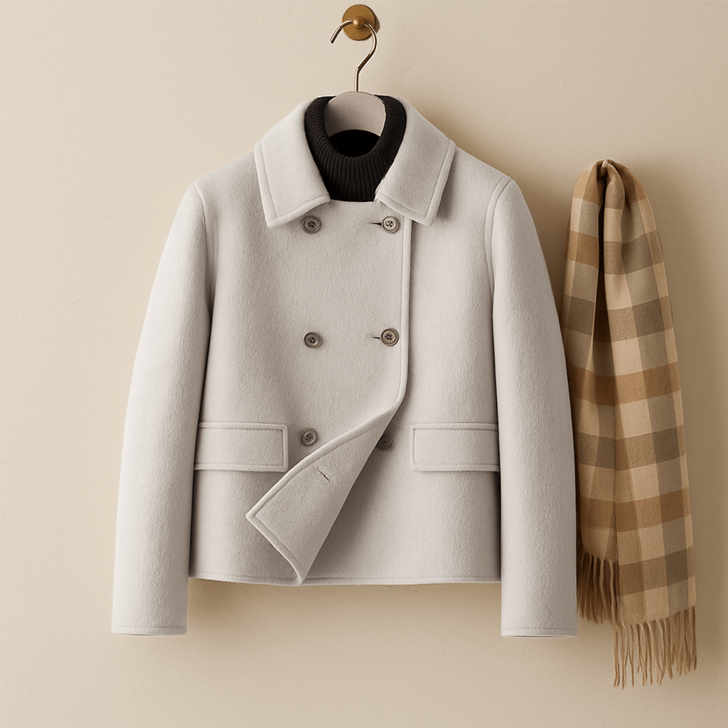 Camille Overcoat blends a soft wool blend with a refined double-breasted silhouette, accented by golden buttons for timeless sophistication. A cropped hemline introduces a modern edge, making it an effortlessly versatile choice for elegant winter styling.
